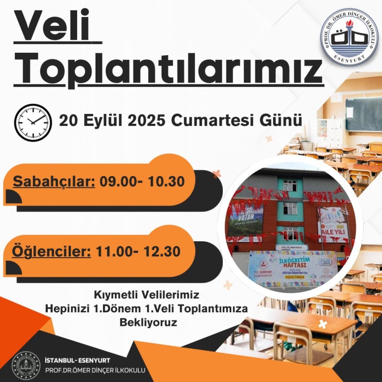 2025-2026 EĞİTİM ÖĞRETİM YILI 1. DÖNEM 1. VELİ TOPLANTISI 20 EYLÜL CUMARTESİ GÜNÜ ÖĞRENCİNİZİN SINIFINDA, SINIF ÖĞRETMENİ VE BRANŞ ÖĞRETMENİLERİNİN KATILIMIYLA YAPILACAKTIR.